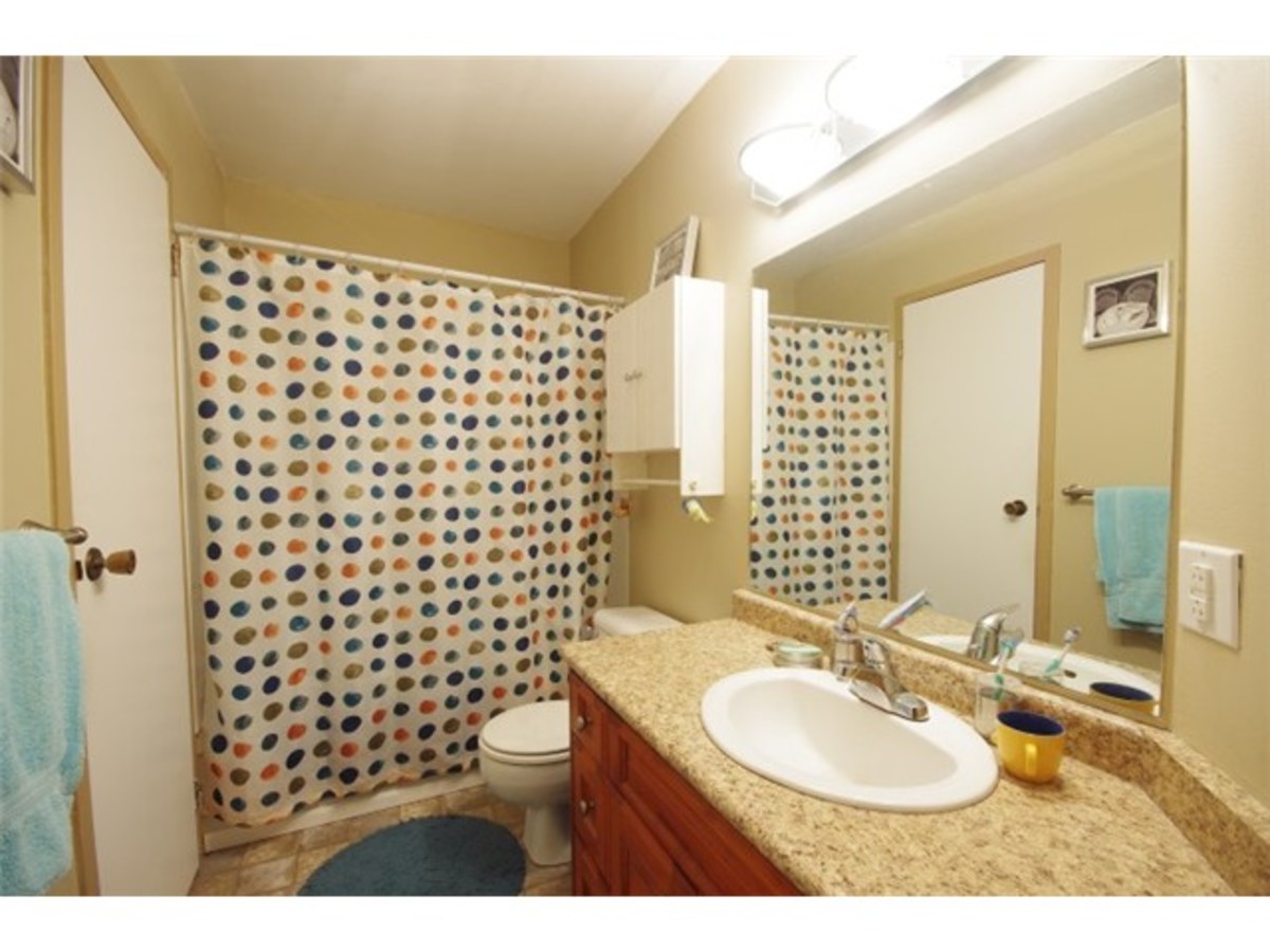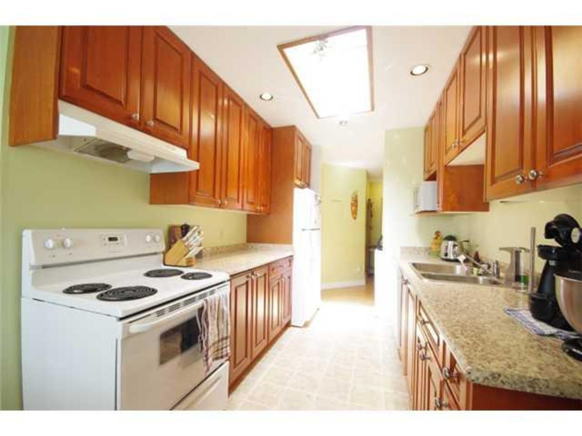 WOW! Amazing unit for this price! Top floor corner unit fully renovated. Awesome location as it faces the courtyard and cherry blossom trees. Kitchen features cherry coloured cabinets, new countertops, all newer appliances and a skylightwith beautiful wood trim. Quaint little dining room off the kitchen and huge living room with gas fireplace. Patio is big and quiet. Master bedroom has huge walk in closet and cheater ensuite. Fully re-done bathroom with new countertops, cupboards and wrap around shower. This unit comes with the largest storage locker (12x8) and a convenient parking spot. Laminate throughout, fresh paint and baseboards. Walking distance to skytrain, bus, malls, hospital, SFU and both sets of schools.