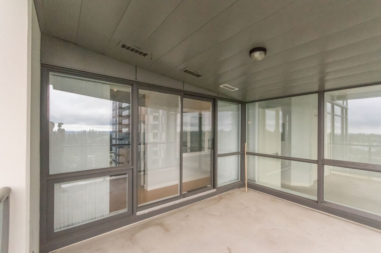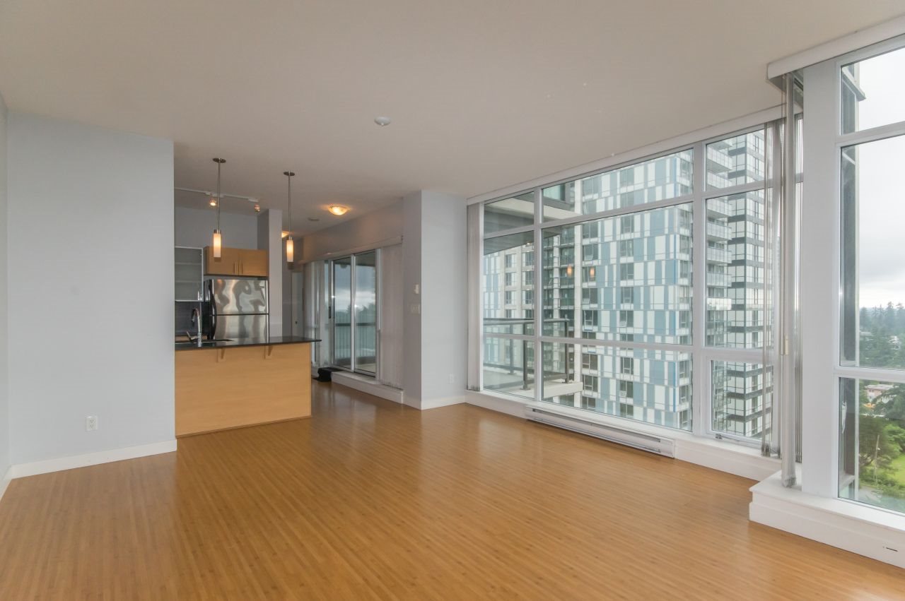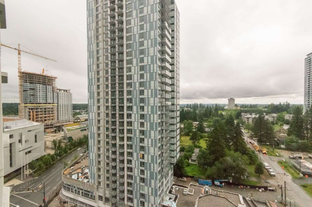 South facing 1 bedroom & den corner unit with wonderful city view. Featuring 9ft ceilings and floor to ceiling windows in the living room and bedroom. Open kitchen with granite countertops, large living room, oversized covered balcony to enjoy year round. Good size bedroom and glass den perfect for your office space. Very central location (close to transit, shopping, SFU, Library, City Hall, restaurants & skytrain). Enjoy a fully equipped fitness centre, media room, multipurpose lounge with bar and pool table for your social gatherings. Needs some paint and new carpet in the bedroom & den but with a little TLC this could be a stunning unit!