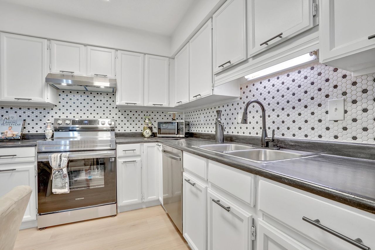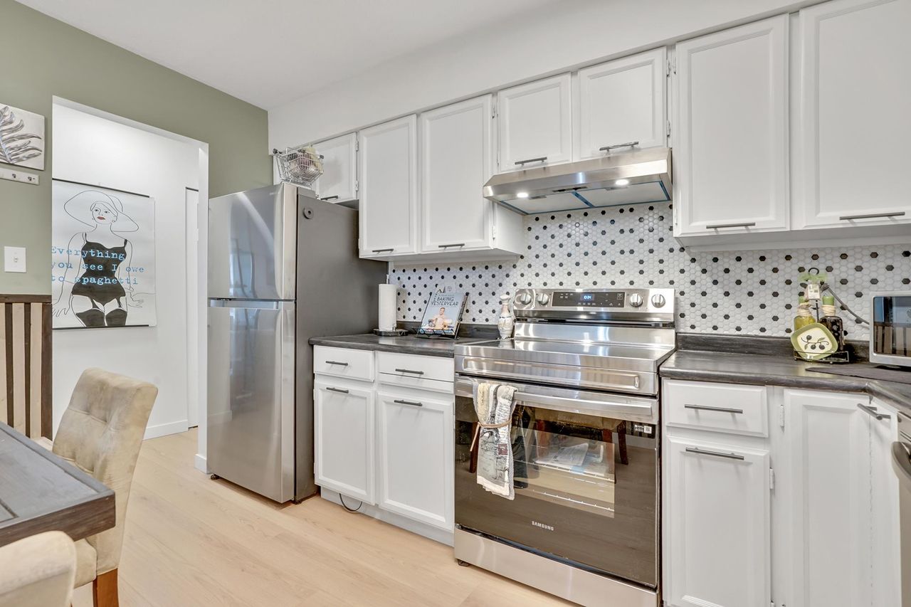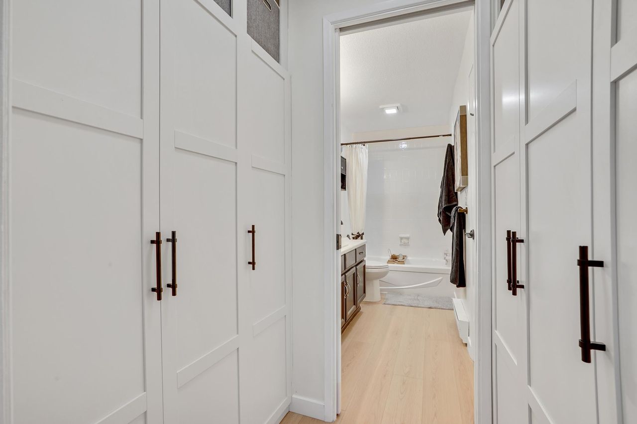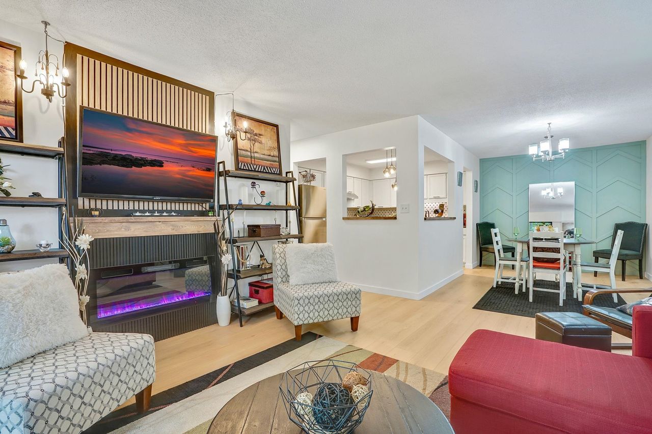 Discover modern, top-floor living in this bright, south-facing condo. Recently renovated, it boasts new wide plank waterproof laminate flooring, designer colours, and a kitchen with new stainless steel appliances and a cozy built-in banquette. Enjoy the spacious living room with an electric fireplace, formal dining with on trend feature walls, two generous bedrooms, primary with walk thru closet with custom built-ins to stylish bathroom. Plus, the building is pet and smoke-free, includes heat and hot water in the strata fee, and has convenient underground parking. Located near the hospital, cancer center, shops, and dining, this 55+ community offers comfort and convenience.